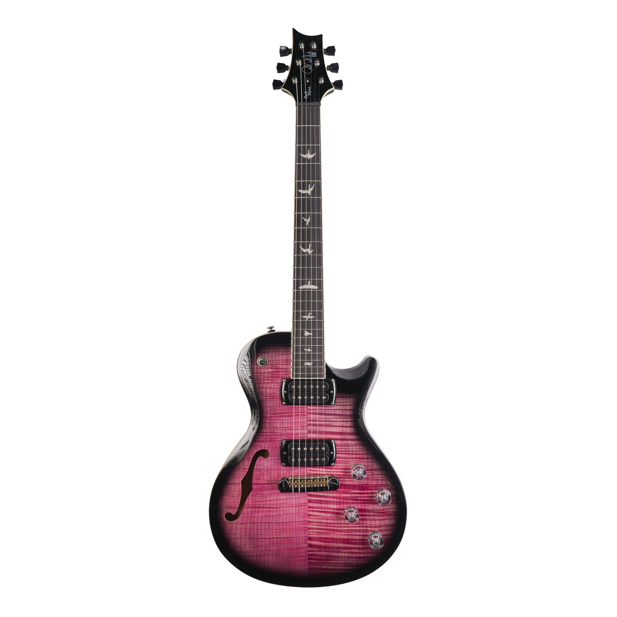 PRS SE Zach Myers, 1Z – Elderberry Burst, folheado de maple flamejado, tampo de maple, corpo semi-acústico de mogno com friso creme (entalhe em violino raso) com orifício em “f”, perfil Wide Fat, braço de mogno com 22 trastes e acabamento acetinado, escala de 24,594″, raio de 10″, escala de jacarandá, marcações de pássaros, nut PRS, captadores 245 “S”, novos anéis de captador inclinados, controle de volume e tonalidade para cada captador e chave seletora de 3 posições, ponte fixa ajustável PRS, tarraxas vintage PRS, ferragens em níquel, acabamento em poliuretano de alto brilho, capa PRS SE.